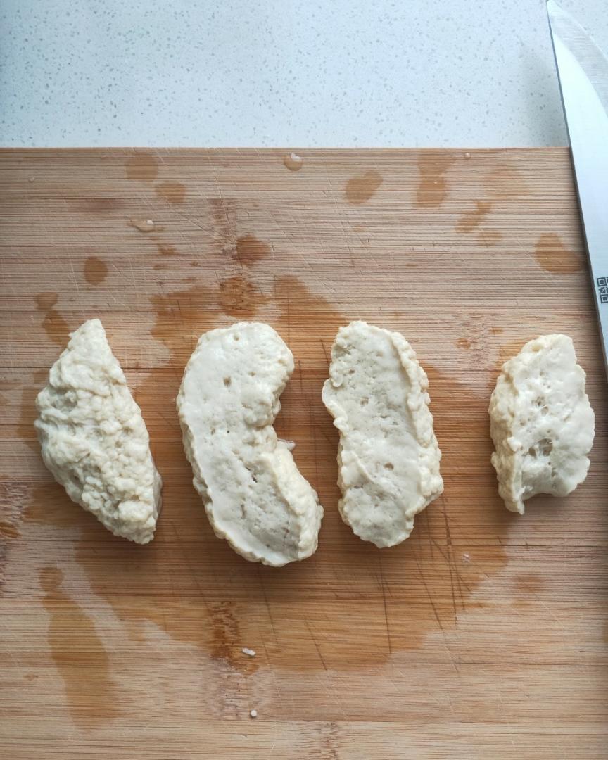 然后轻轻的把面筋拉一下,拉长一点,不要使劲拉,使劲的话肯定就会拉断