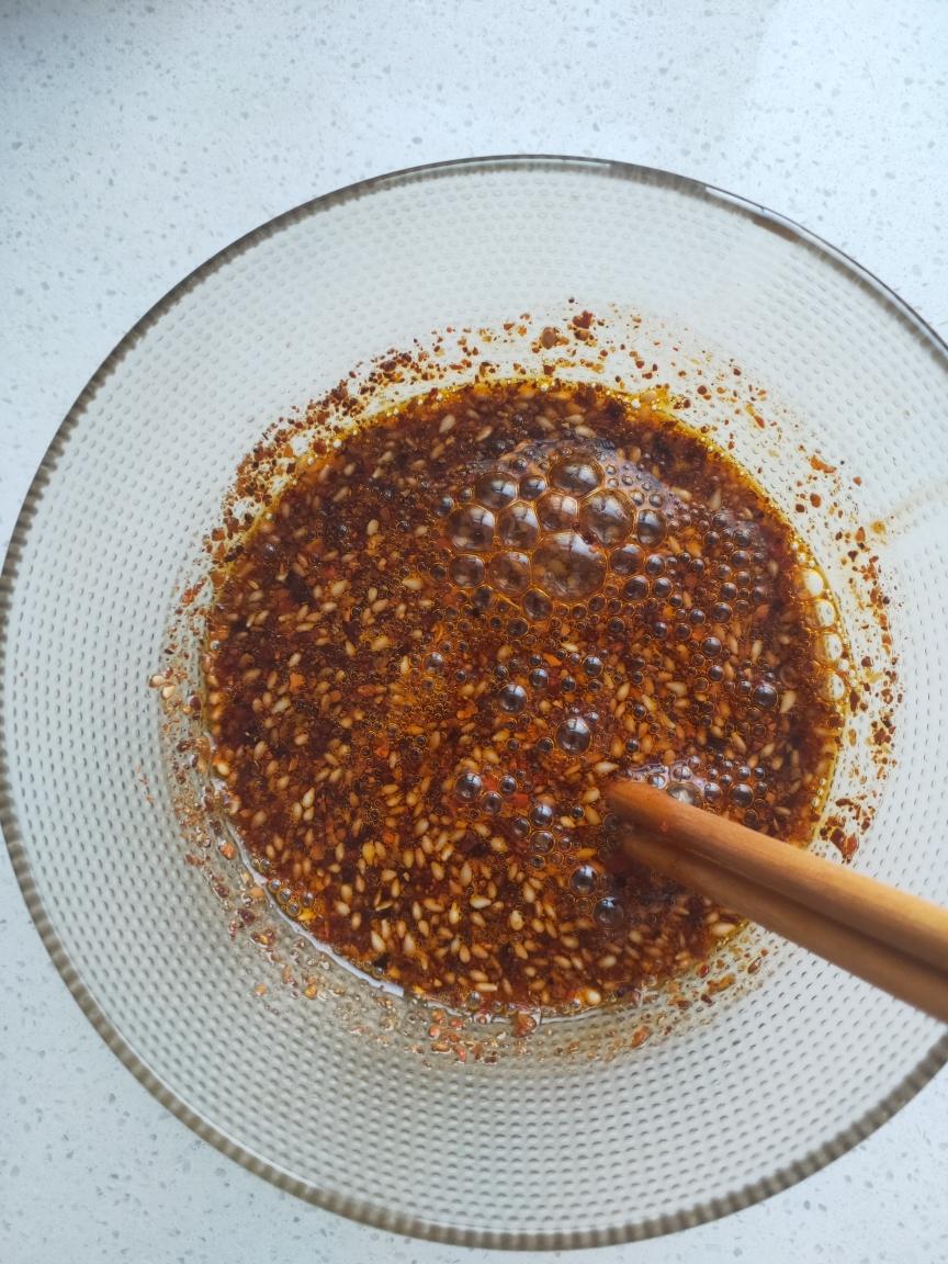 热油泼进去,搅拌均匀,加入孜然粉,一点酱油,烧烤酱就好了