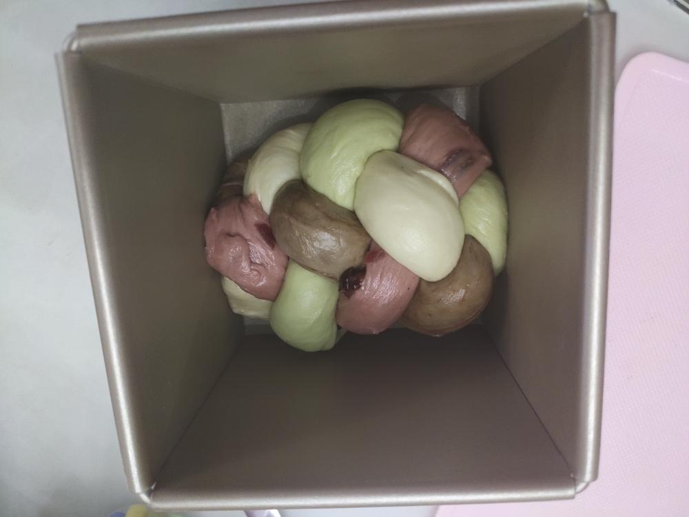 将面团称重,均匀分为四份,分别揉入可可粉+可可豆,抹茶粉,红曲粉+蔓越莓,剩余一份原味面团 盖保鲜膜,进行第一次发酵至两倍大,手指粘粉戳洞不塌陷不回缩就可以啦
