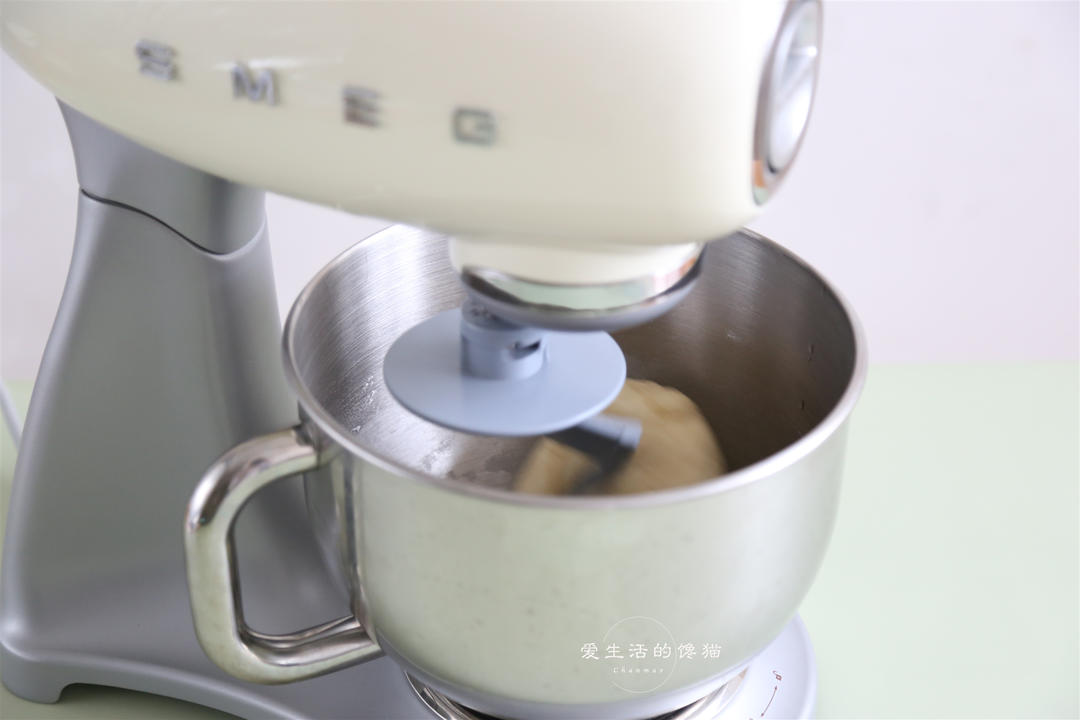 将油皮的食材放入SMEG厨师机里面,启动1速混匀后,转2速搅拌5分钟,能拉出不容易烂的薄膜即可。