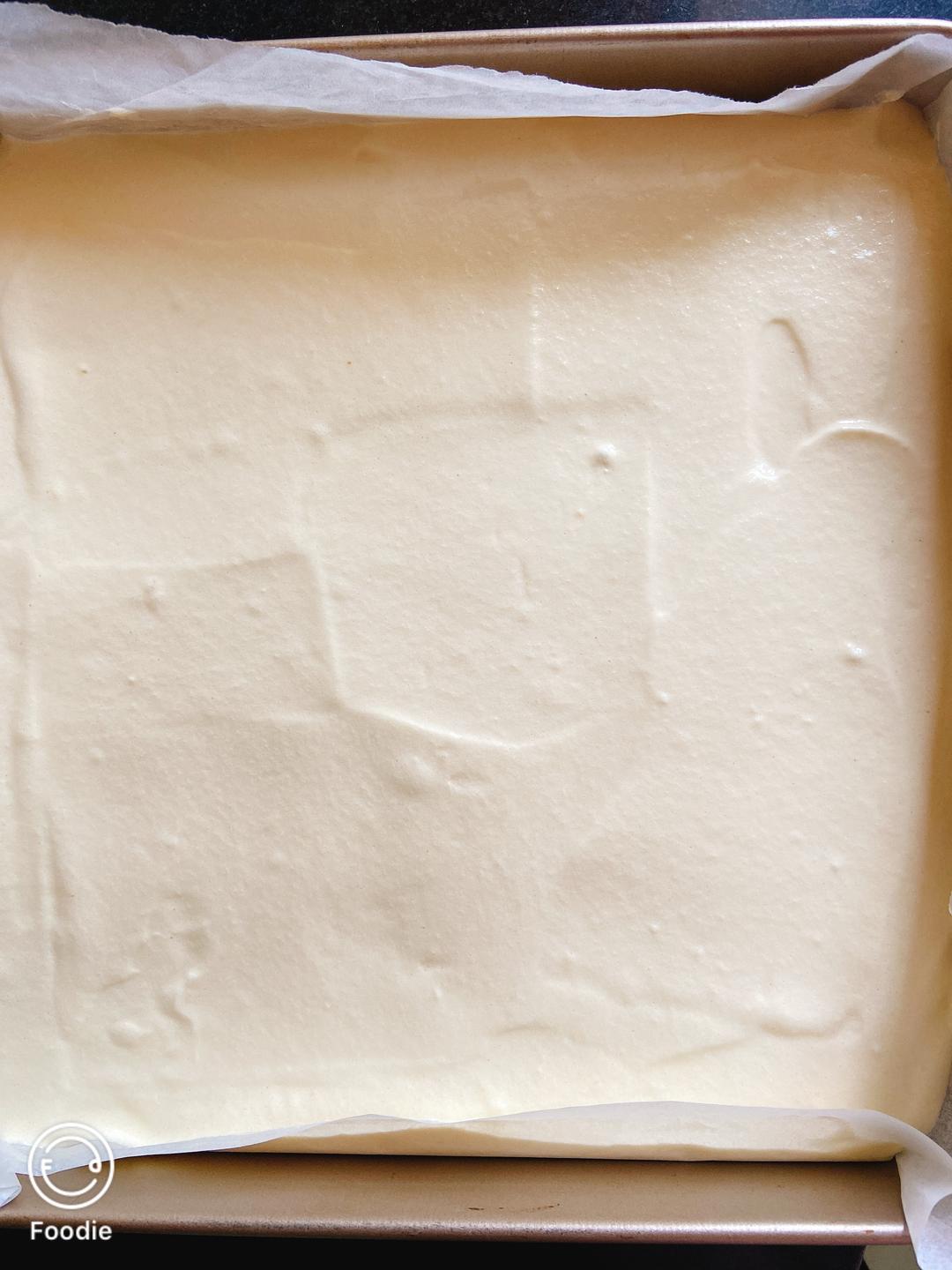 搅拌好的面糊放入准备好的烤盘里,抹平,震出气泡。