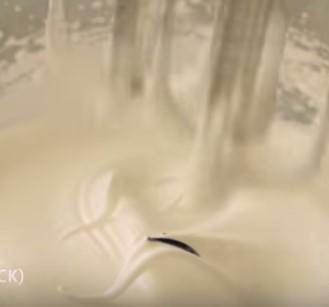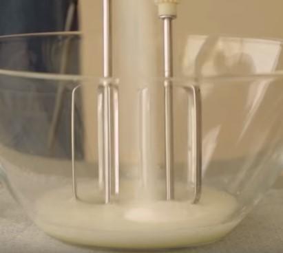 倒入粉类切拌到飘带状。