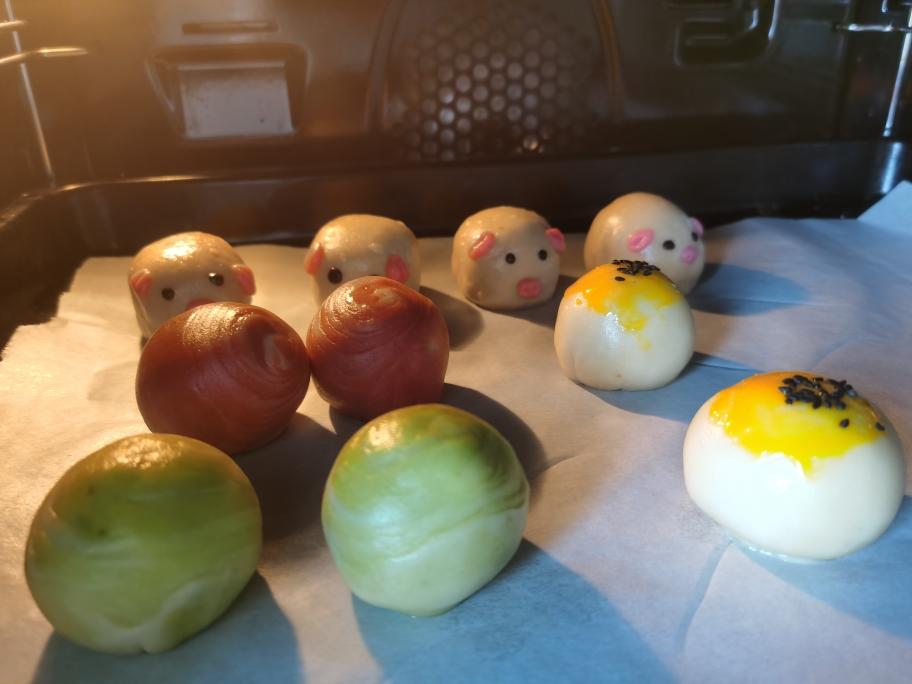 做小猪的🐷 先去8g左右淡粉色水油皮面团擀薄盖在蛋黄酥上