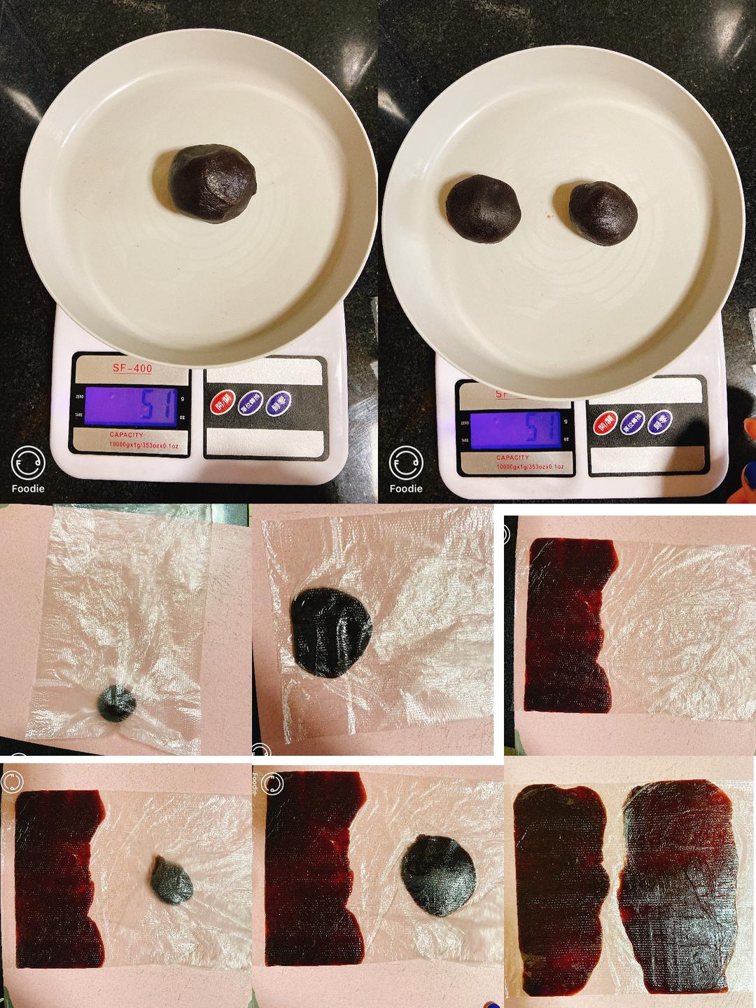 在发酵面团的时候帮豆沙处理一下,帮一50克左右的豆沙分成两份,放入保鲜袋擀平,我是一个保鲜袋放入两个豆沙团。看图哦!
