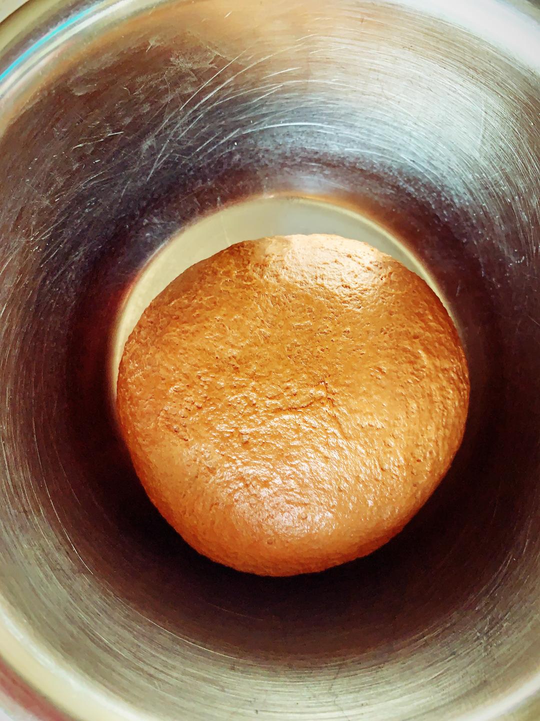 可可面团发酵好两倍大,手指戳洞不回弹即可,把面团均分成三个小面团,滚圆后盖保鲜膜松弛15分钟