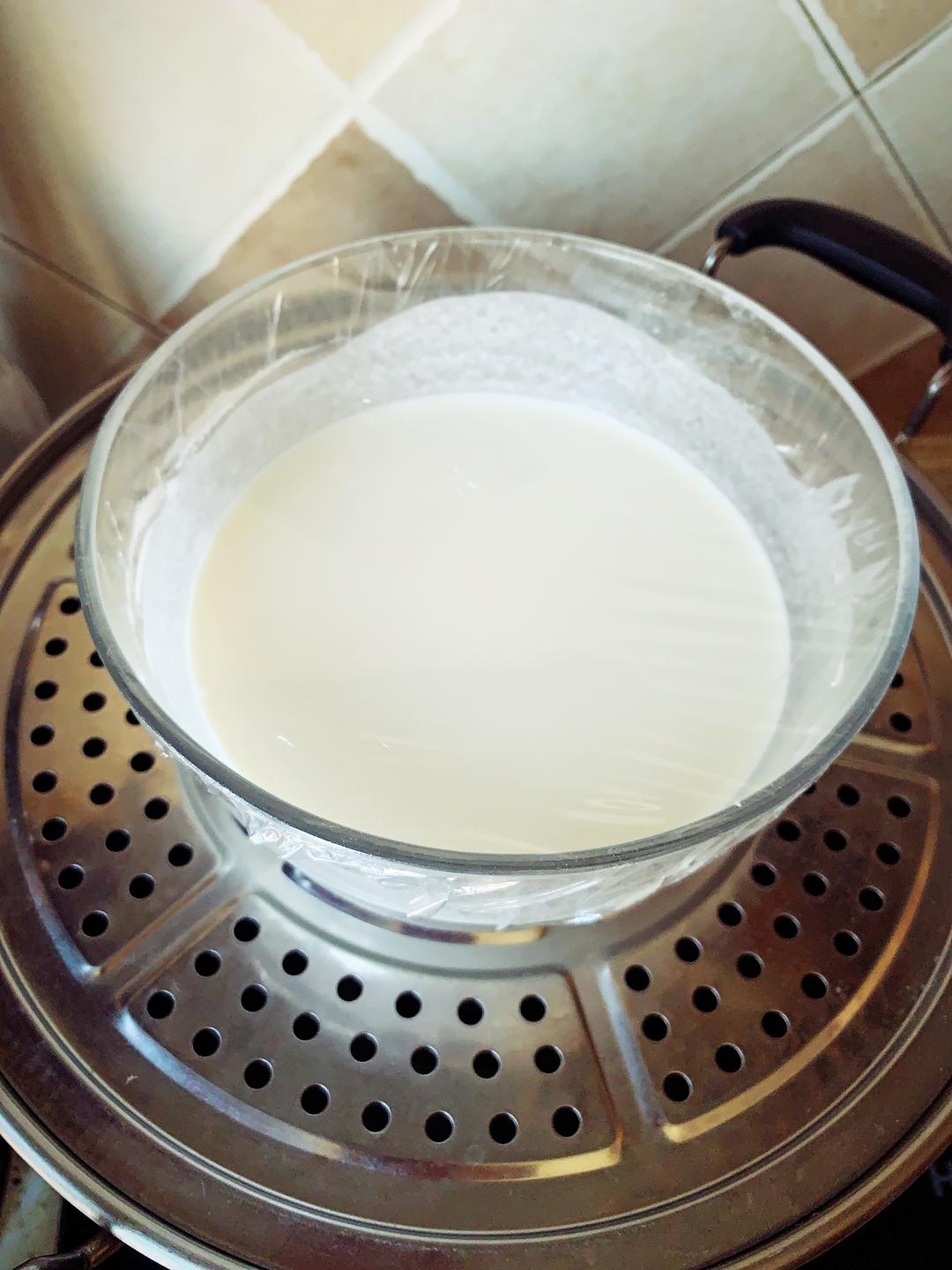 盖保鲜膜大火蒸15分钟,凝固变成面团状即可