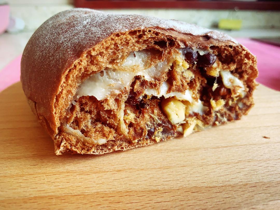 铺上馅料,可以天马行空发挥想象,我这个铺的是红糖+烤碎核桃+葡萄干+蜜红豆