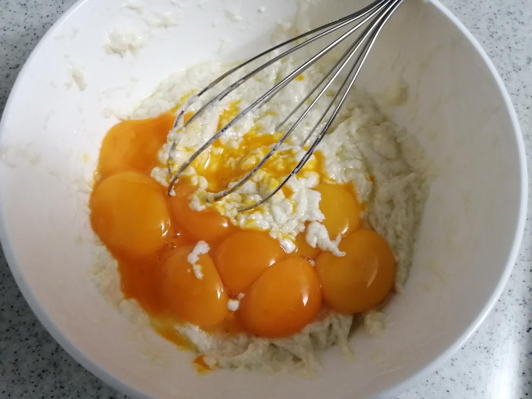 加入蛋黄和香草精(为了去蛋腥,也可不加),Z字形划匀,