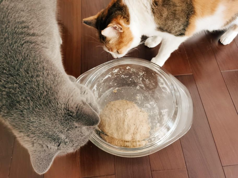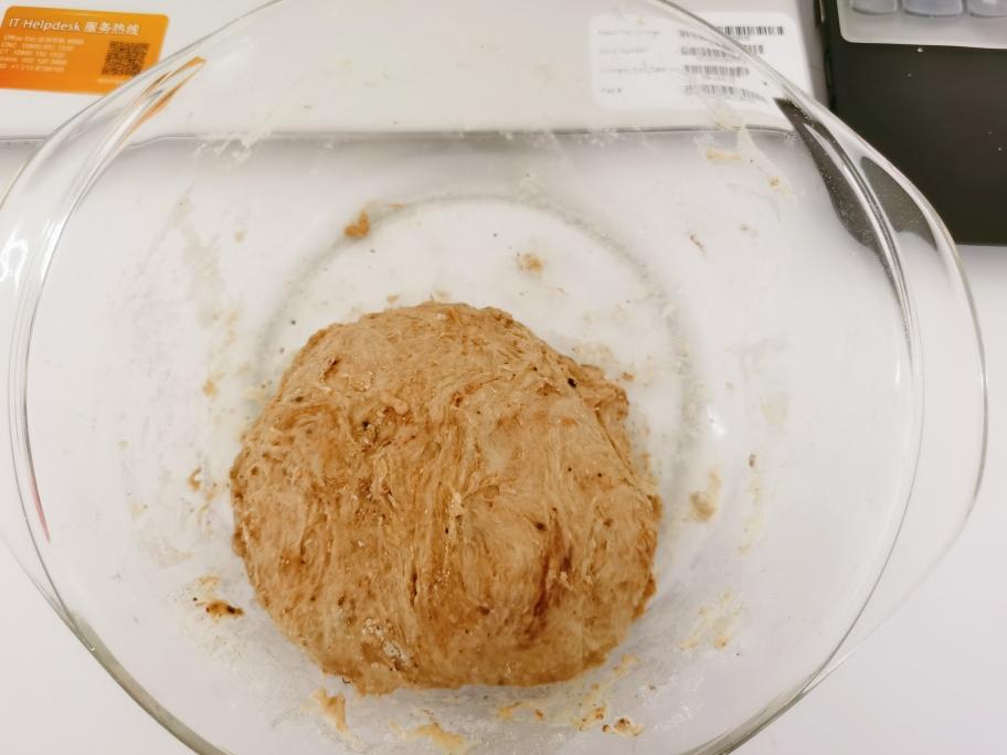 取出面团,在案板上轻轻揉面2-3分钟,揉到面团不粘手的程度。再次将面团放回玻璃碗里,盖上湿布/盖子,常温下基础发酵,使体积膨胀至2倍。