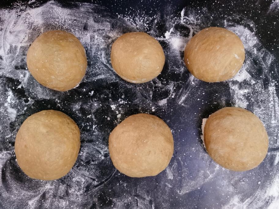 台面上撒一些干面粉。取出发酵好的面团,排气,分成六份差不多大小的,滚圆,盖湿布静置松弛20分钟。