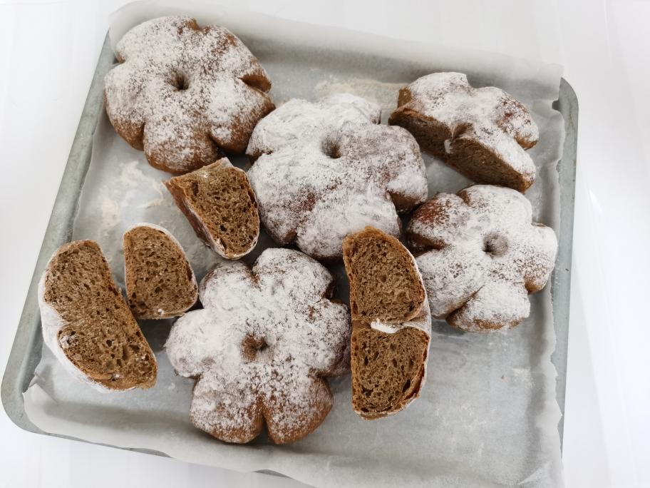 小面团再次排气,滚圆,用蘸了干面粉的手指在中心戳一个洞,这样就能做出稍微扁平一点的造型。在面团的周边用刮板切出5-6个切口。整形完成的小面团放到铺了油纸的烤盘里,盖湿布,常温下二次发酵,使之膨胀至1.5-2倍大。