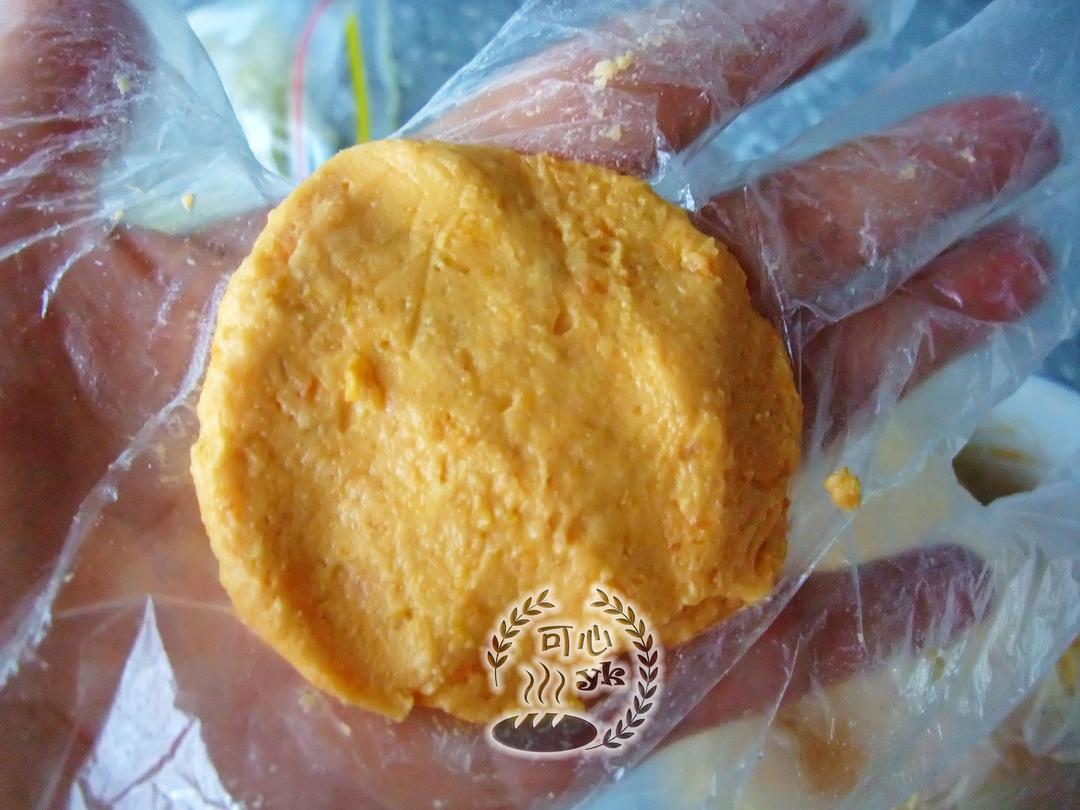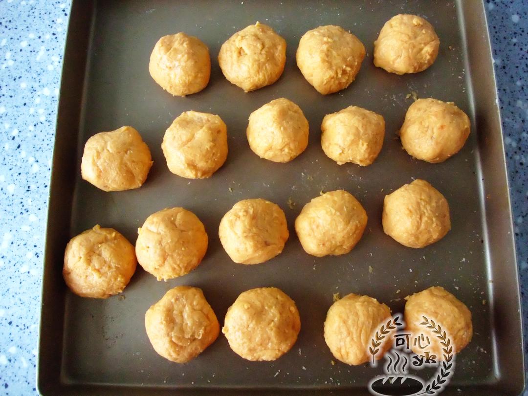取25克地瓜泥,用掌心搓成圆球、按扁。