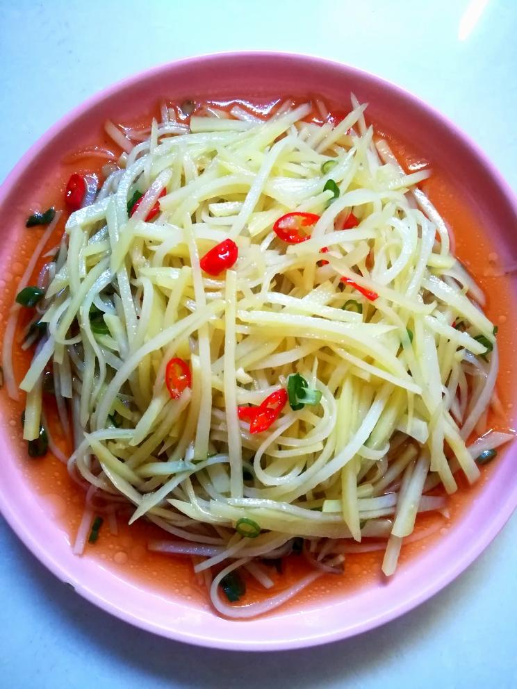 均匀的拌在土豆丝里,再撒上葱花拌匀可以开吃了。
