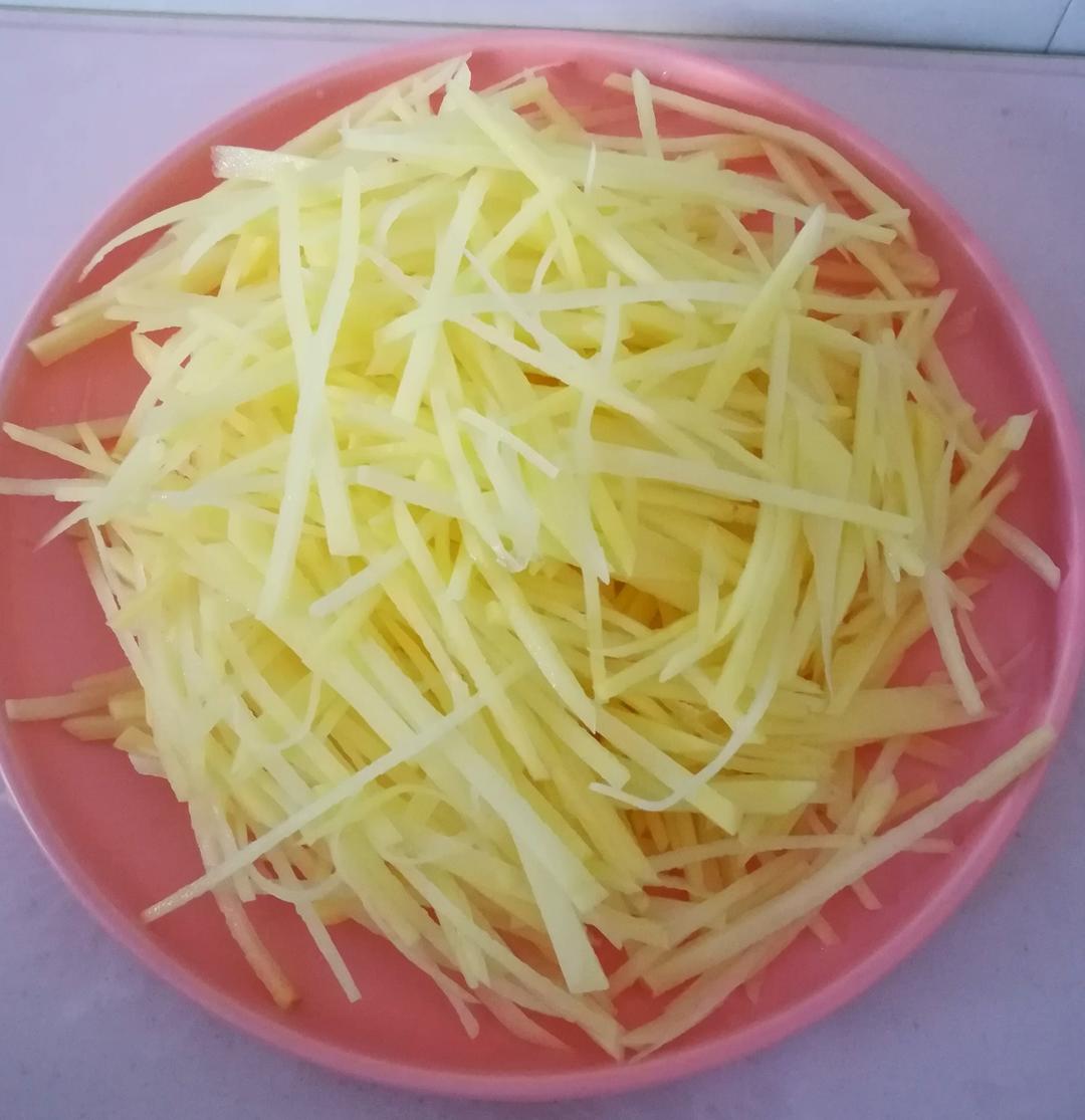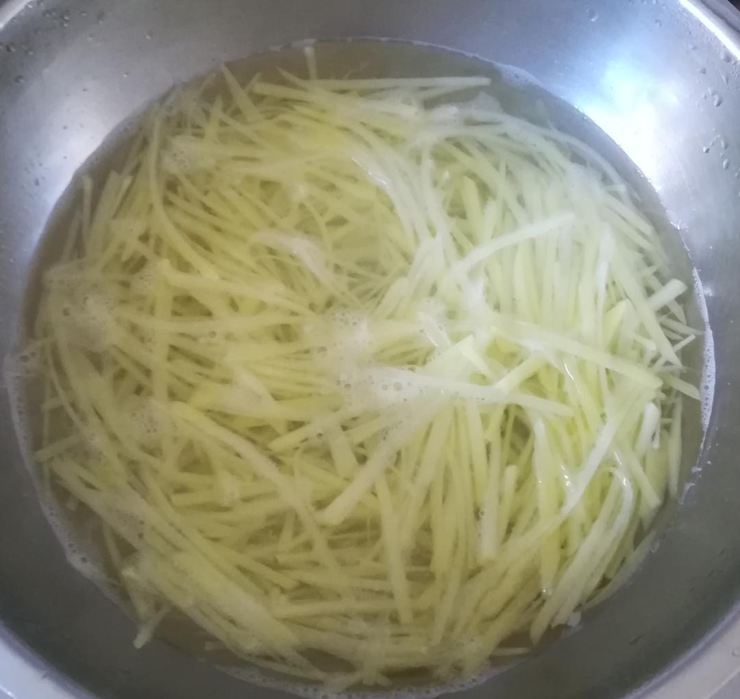切细丝,用冷水多洗几次,洗去淀粉,在开水里煮一,两分钟,捞出。
