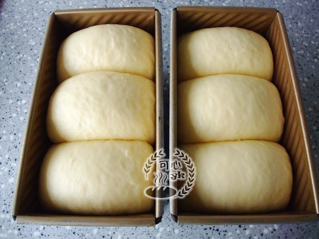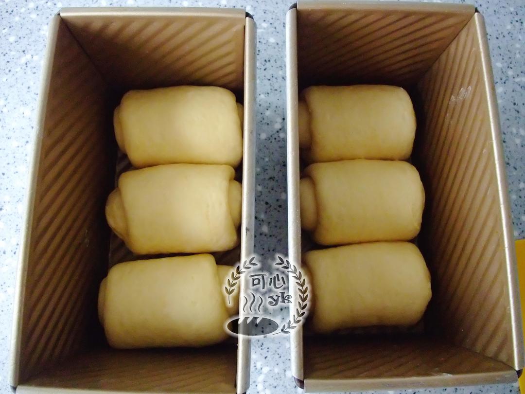 接口朝下,一个方向排入土司模内。烤箱里放碗热水,把面包放入进行最后发酵。温度37度,湿度75%的环境下大约发酵80分钟左右。