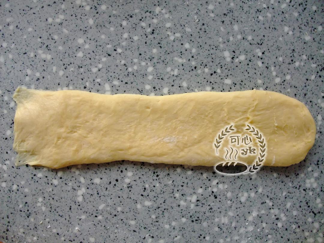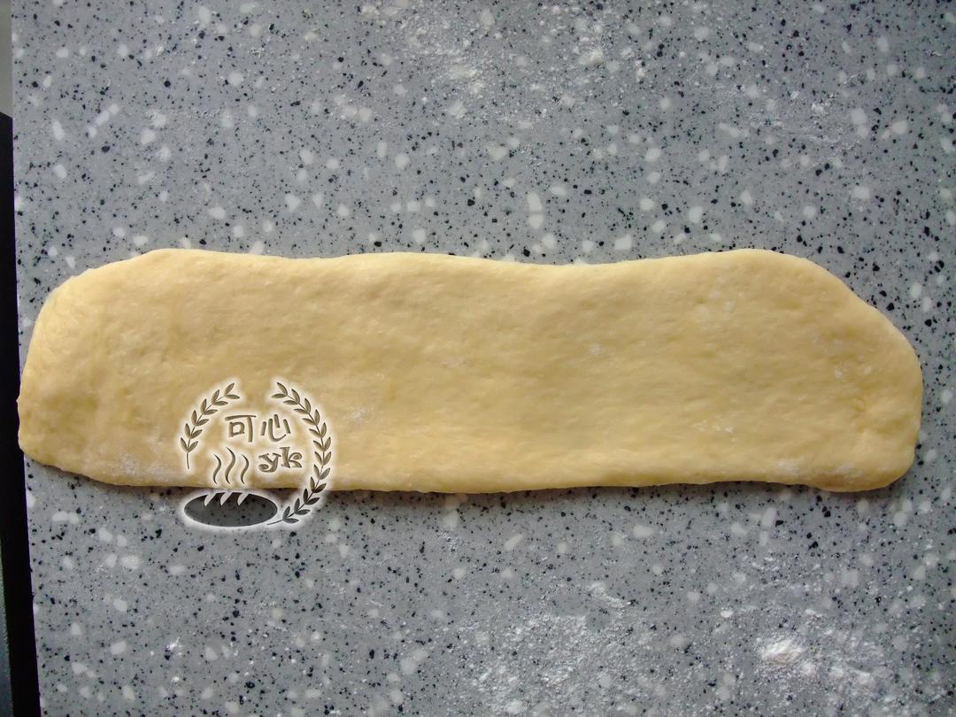 进行第二次擀卷。取一份用手掌拍扁排气。将面团上下擀长,约30CM。(这个图逆时针旋转90度看)