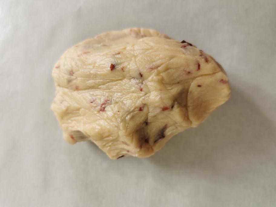 准备一口不锈钢盆,加入软化的黄油,糖粉、盐、鸡蛋液用刮刀拌均匀,打蛋器通上电打至蓬松,发白的状态,多打一会,曲奇饼干的口感会更加酥脆一点,但是千万不能打过头了,打过头的状态就会油水分离了,打好的黄油里加入过筛好的低粉和奶粉,橡皮刮刀用压拌的方法压拌均匀,在加入玫瑰花酱拌匀。