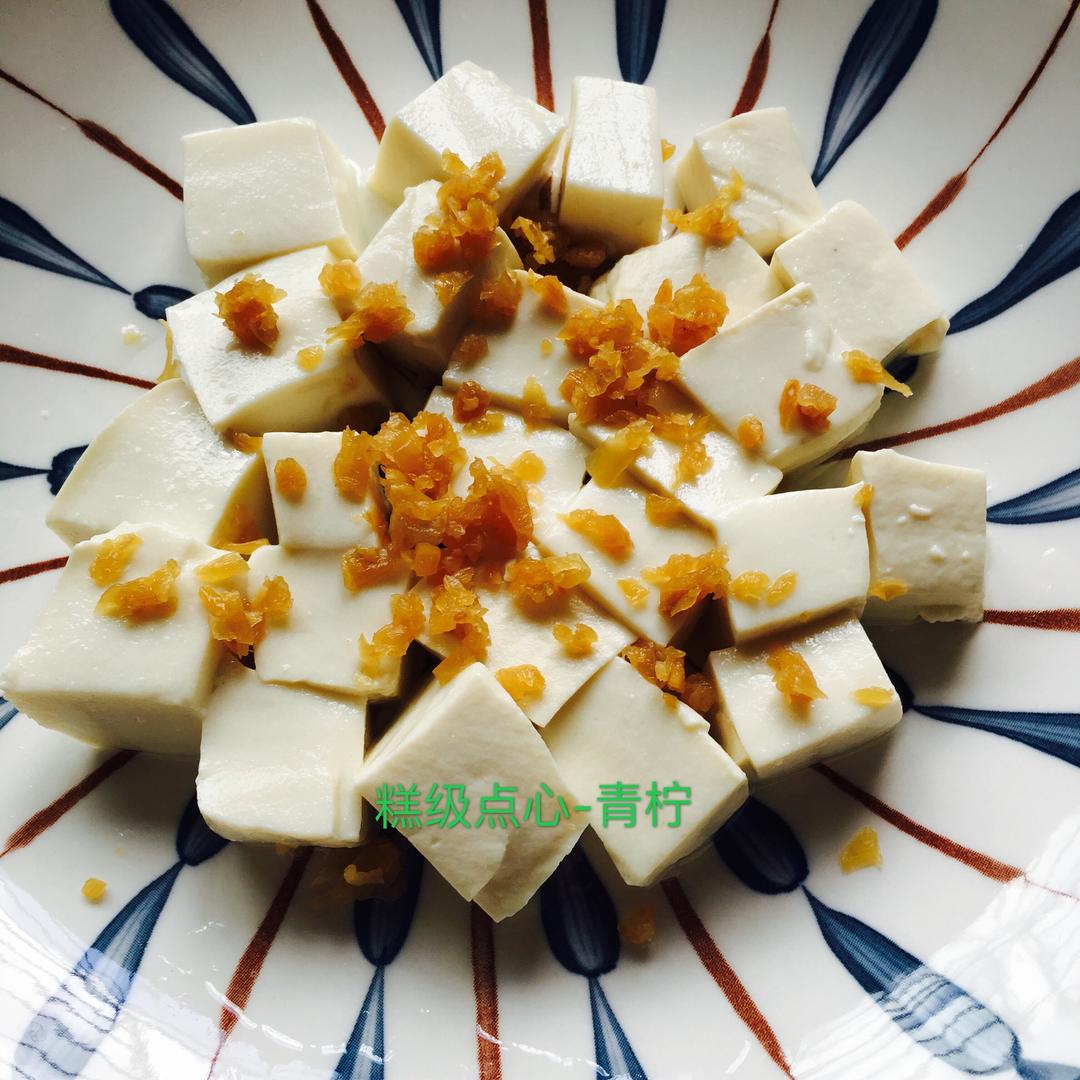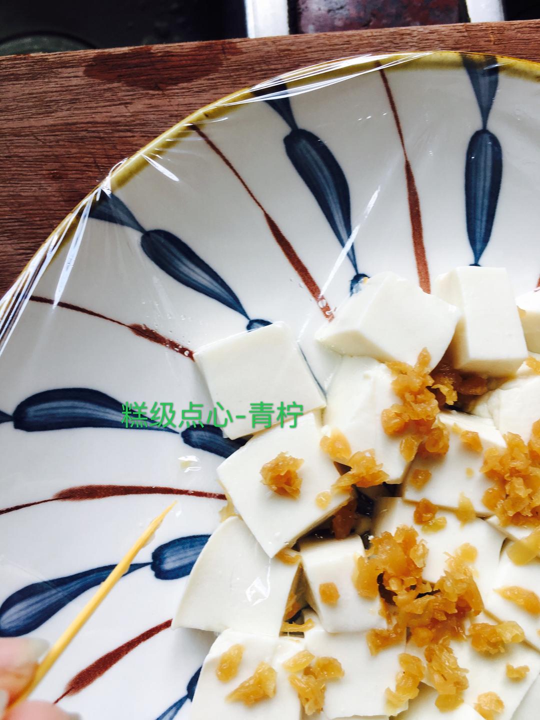 豆腐切成小块,沥干水分,装盘撒上冬菜,盖上保鲜膜