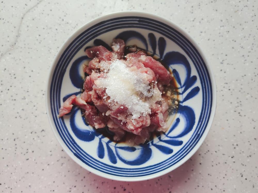 猪瘦肉洗净之后切丝,然后加少许料酒,生抽,一小勺淀粉,一小勺细砂糖,几滴食用油
