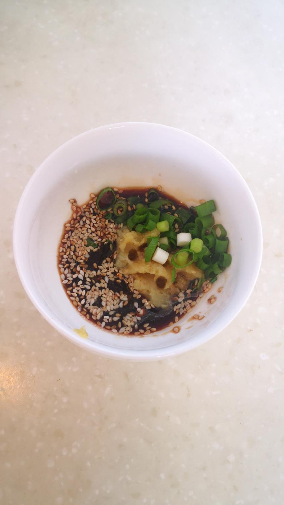 等待的过程,准备调料。我用了白糖,生抽,醋,鸡精,蒜泥,小葱,麻油。(女儿不吃辣,所以没放辣椒)