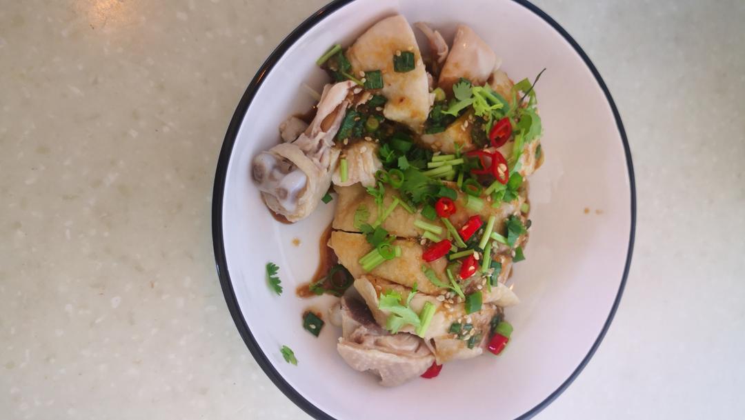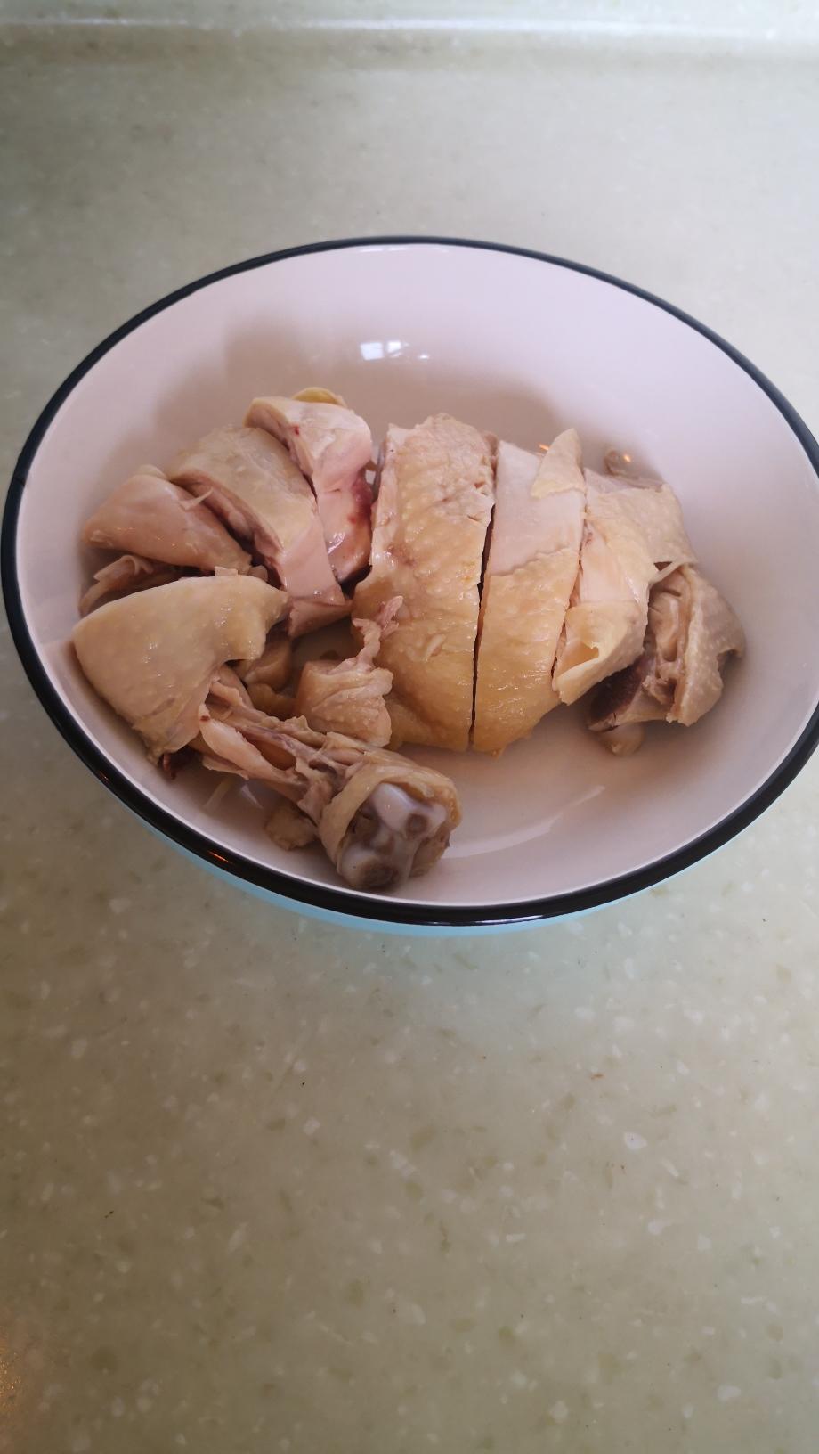 鸡腿冰水浴完成了,切好装盘就可以了,把调料淋在上面就大功告成了。