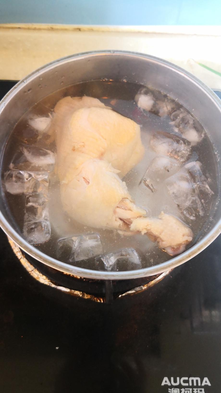 煮好的鸡腿捞出,整个浸入到冰水中,这一步的目的是让鸡腿,特别是鸡皮遇冷收缩,过冰水的鸡皮会非常有嚼劲。这一步是鸡好吃的关键哟!可以把盆放进冰箱20分钟,让鸡腿充分地享受冰水浴。