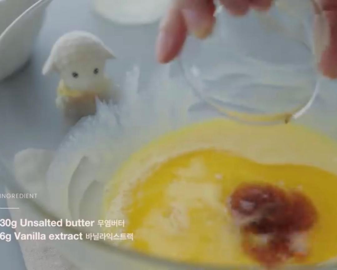 融化的无盐黄油(液体)和香草精加入蛋黄糊里混合均匀