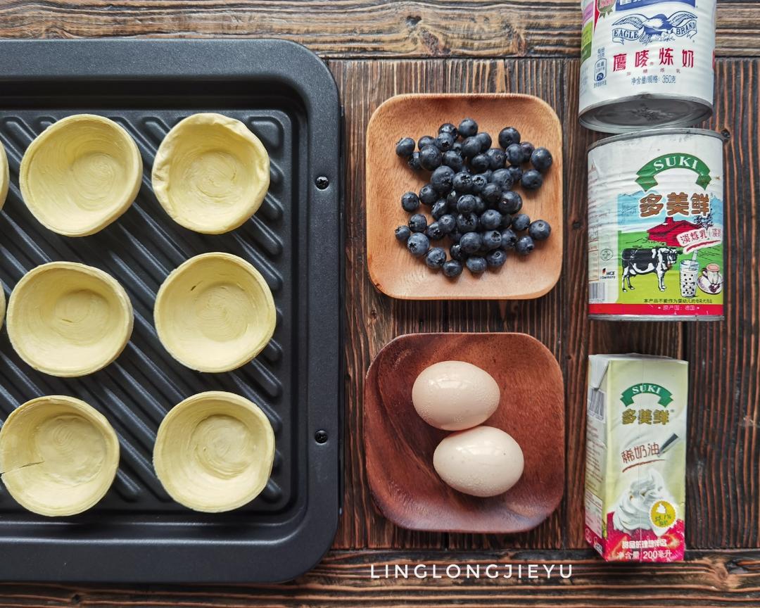 每个蛋挞皮内放6~8个蓝莓,倒入蛋挞液,至八分满。