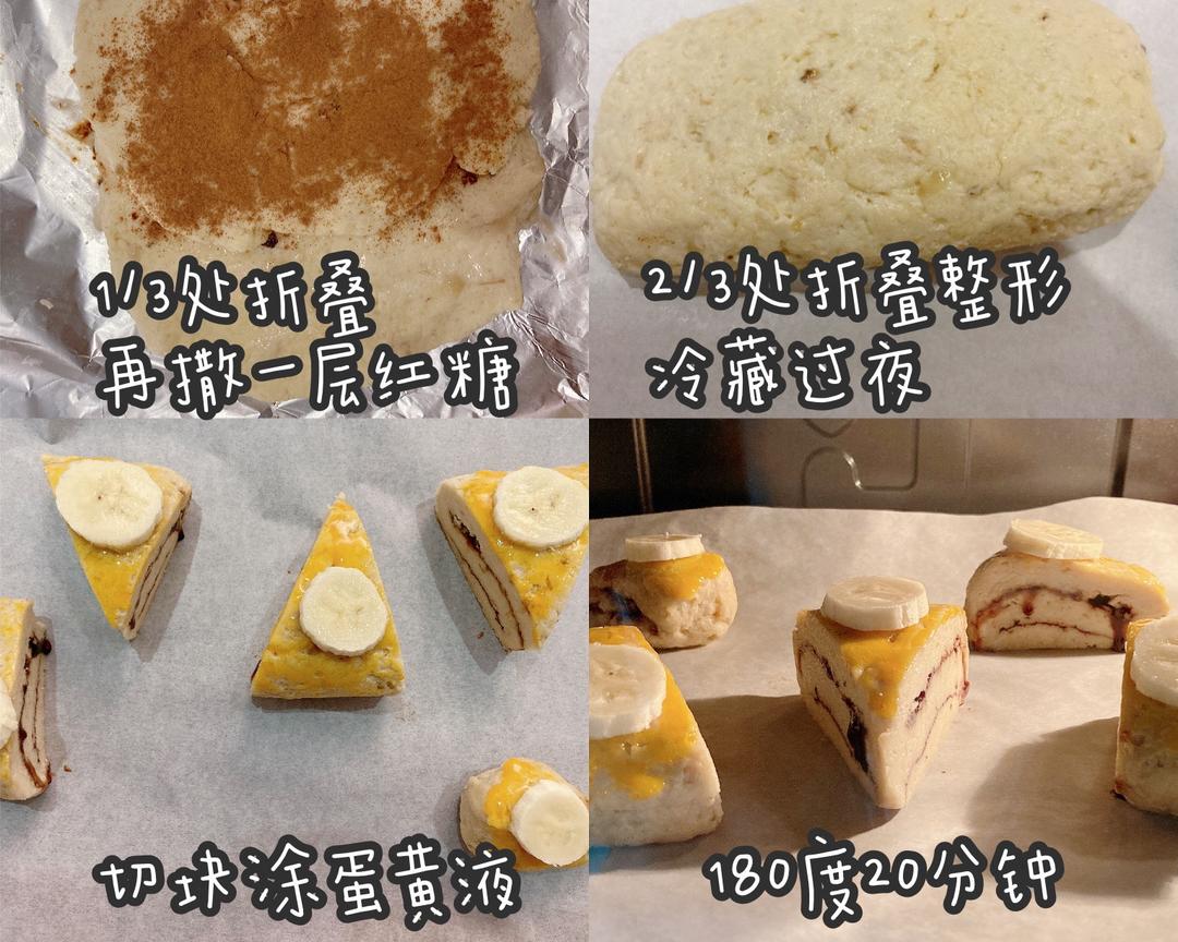 香蕉压泥,加入面粉、泡打粉(或酵母)轻轻混合成团,整理成长方形,1/3处铺红糖,折叠1/3后再铺红糖,最后盖上另外1/3,整理收口后冷藏过夜