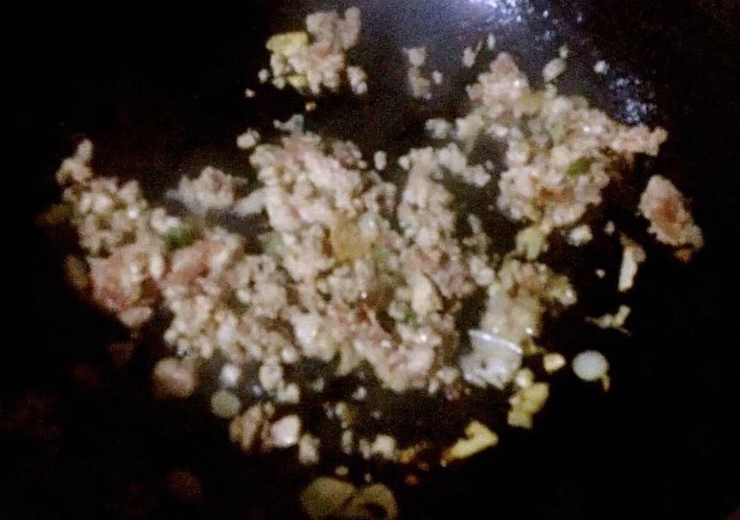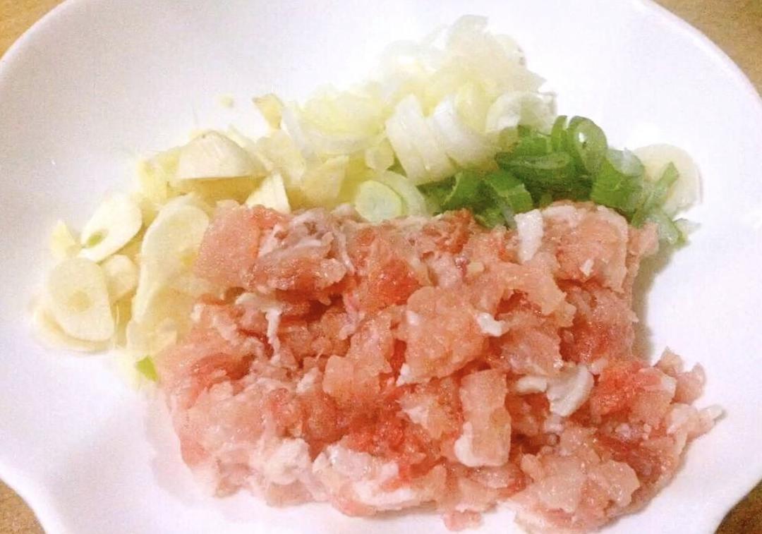 新鲜猪肉剁成肉末葱姜蒜切粒