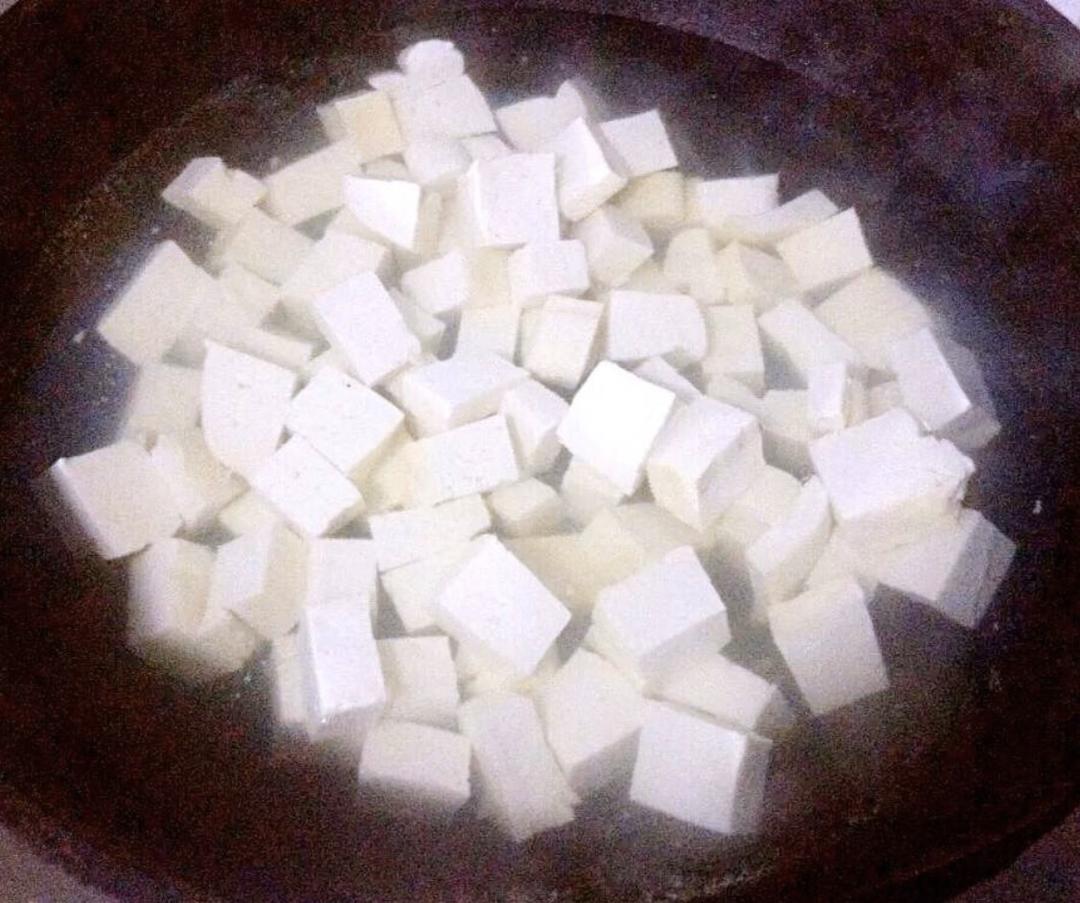 豆腐切成大小均匀的块状放入开水中焯水去除豆腥味