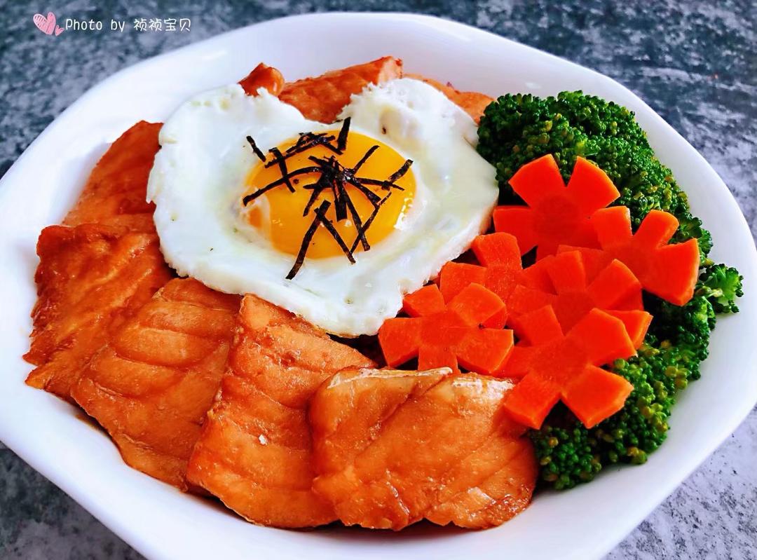 米饭上面摆上煎好的三文鱼、、西兰花、胡萝卜、爱心煎蛋撒上海苔碎就大功告成了