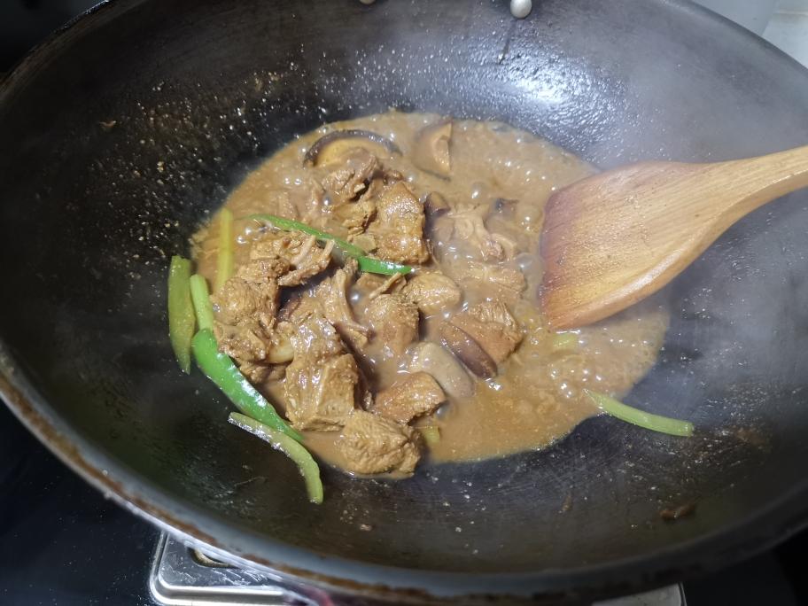 1. 快炖到四十分钟的时候下香菇; 2. 大火收汁。收汁的时候捞出姜片和蒜粒; 3. 汤汁浓稠的时候,加入少量芹菜丝和青椒丝配个颜色(最好用蒜苗,味道更好。没有买到蒜苗,只能用别的配菜凑合一下啦); 4. 倒入事先备好的调料汁,快速翻炒几下,使沙茶的味道浓郁