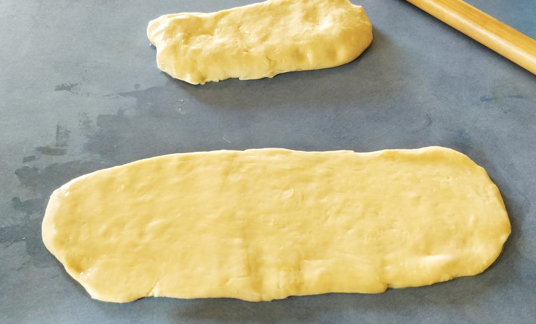 20分钟后手上抹油将面团再揉揣一遍,将面团分成二块,压成长形,表面涂上油密封放冰箱冷藏过夜,隔天早上提前半小时从冰箱取出回温后移放到涂有油的案板上。