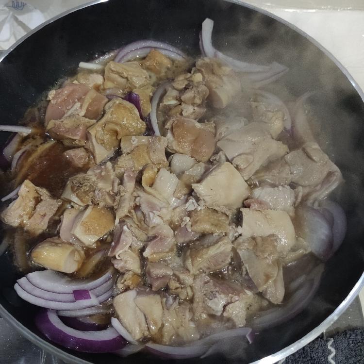 3. 平底锅少油煸洋葱,继续加鸡肉,加入准备好的料汁,大火煮开盖盖小火煮十分钟