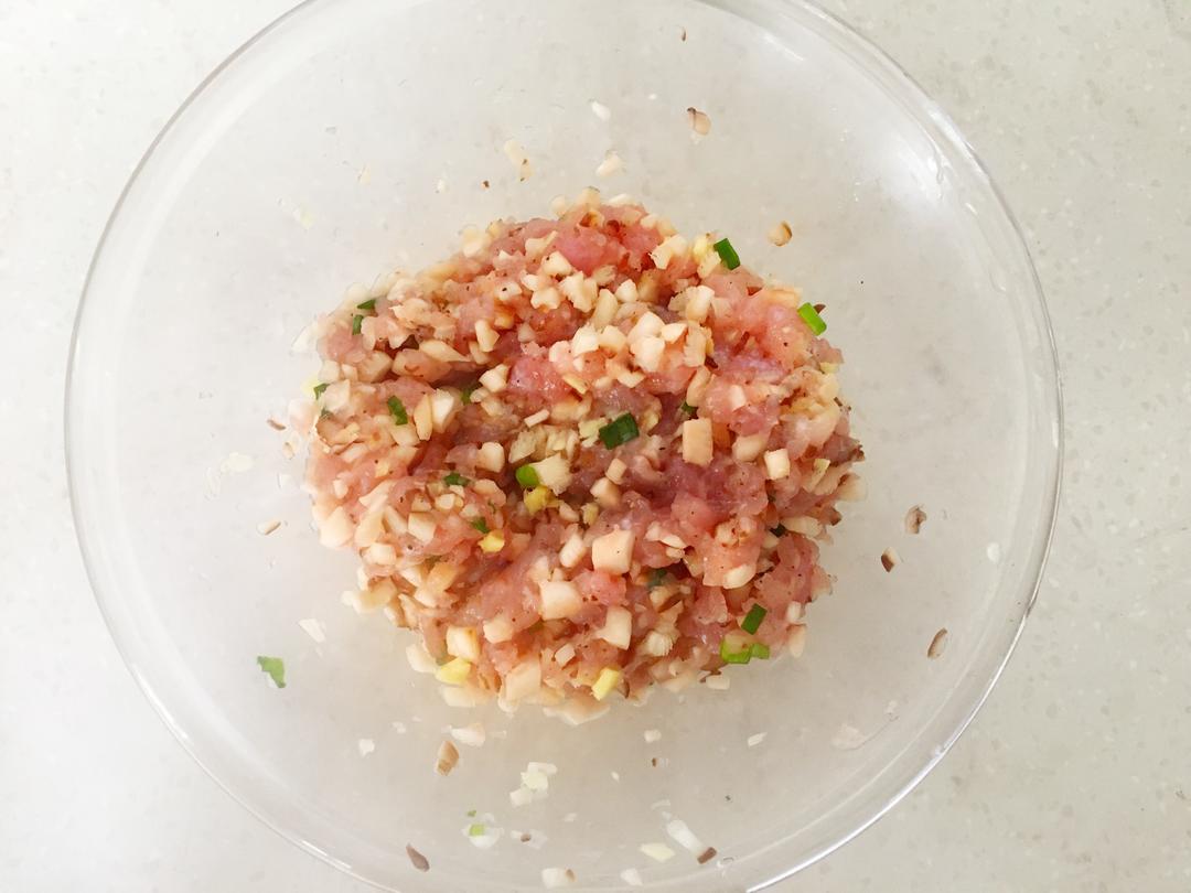 肉糜中加盐、料酒、黑胡椒粉、姜末、葱花。