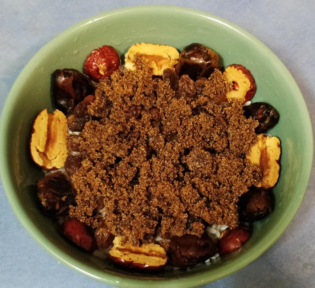 在红枣果干(随意摆放蒸出来的也很棒)上铺放入红糖15克.因果干含糖份.觉甜度刚好,喜吃甜可多放,
