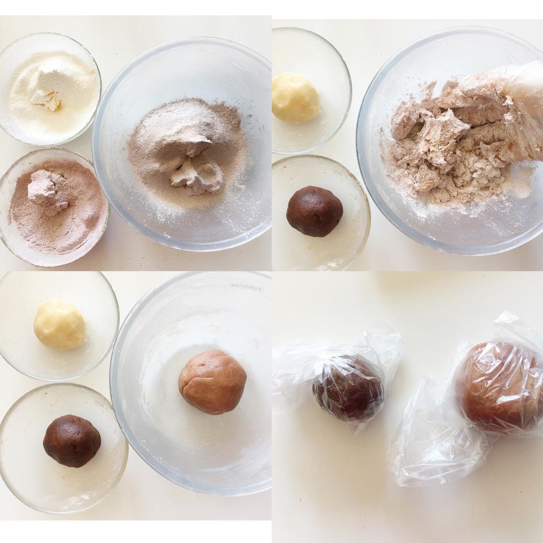 将粉色面粉筛入70克黄油中,深红色面粉筛入37克黄油中,将42克低粉筛入37克黄油中,分别用手混合到无干粉状态后揉成团,装入保鲜袋。