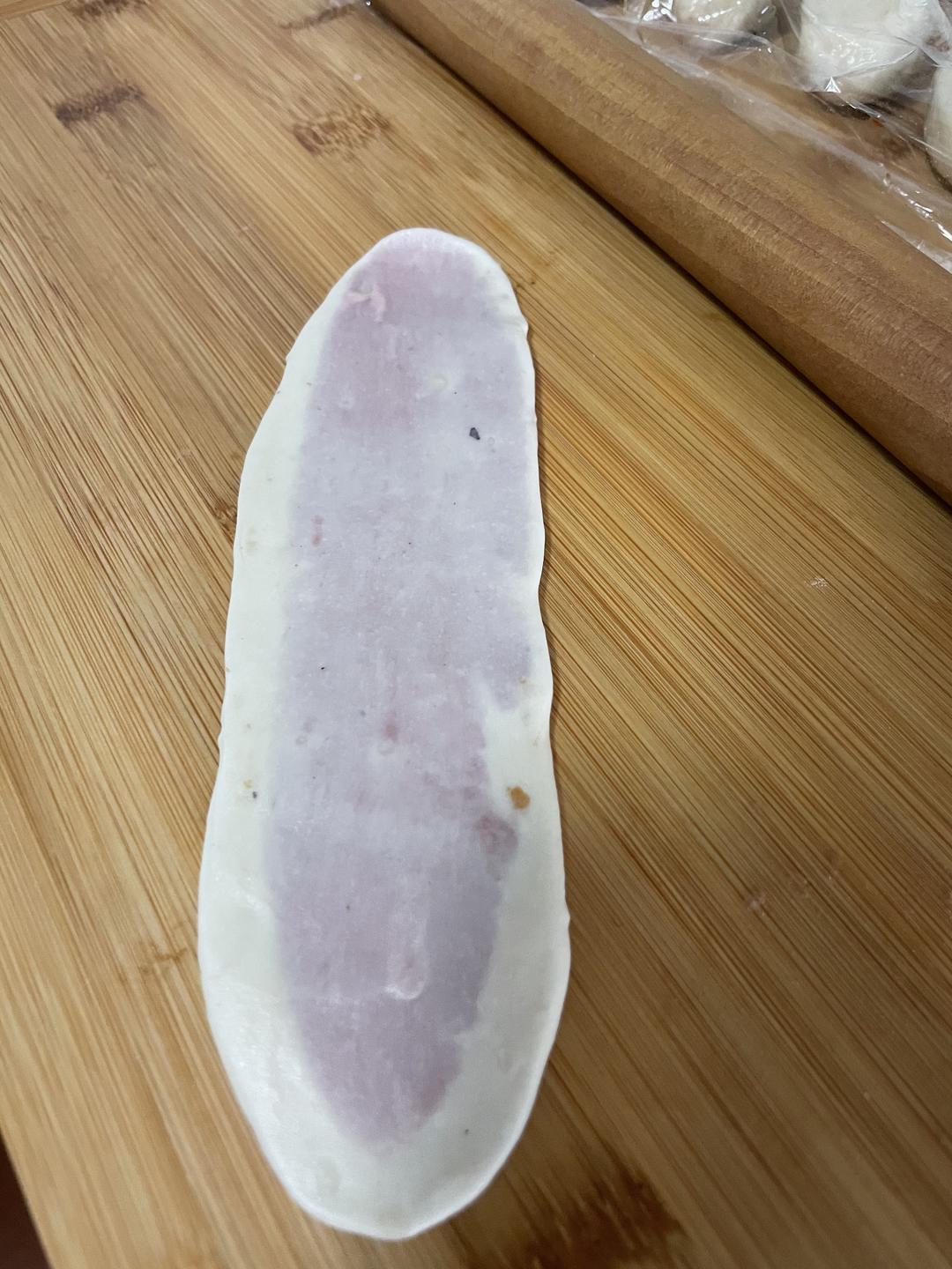 用擀面杖从中间往两头擀成牛舌状,再从上往下卷起来醒发10分钟