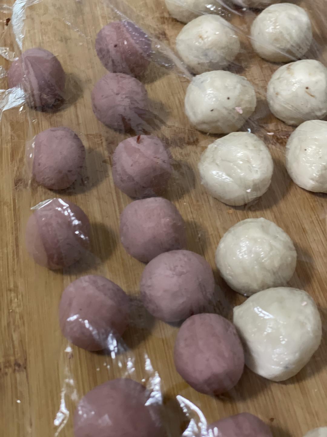 接下来就是不停的包汤圆,跟蛋黄酥一样。油皮包油酥,这时候可以包成椭圆形,方便接下来擀皮。