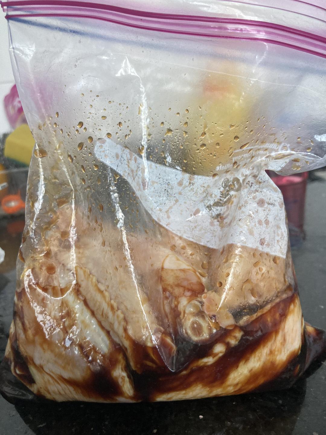 把鸡翅放入保鲜袋 倒入调好的酱汁 混合均匀 放入冰箱 时间越长越入味 中午时间有些仓促,我才腌了半个多小时