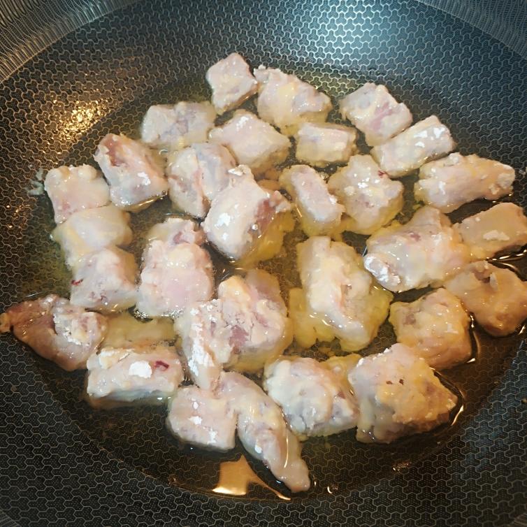 把裹了木薯淀粉的排骨,一块一块的放入油中。