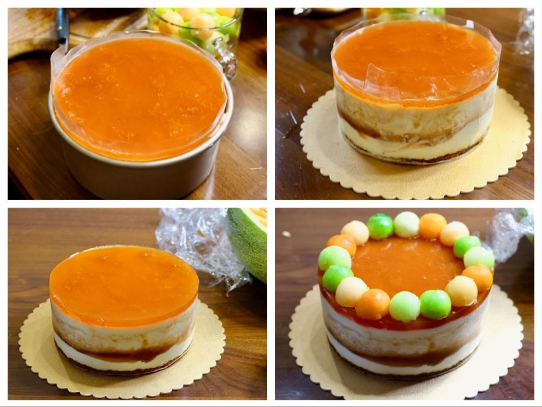 取出完全凝固的蛋糕,用热毛巾敷一下模具四周就可以很容易脱模。,揭掉慕斯围边,在蛋糕表面装饰一圈蜜瓜球和杏肉球。