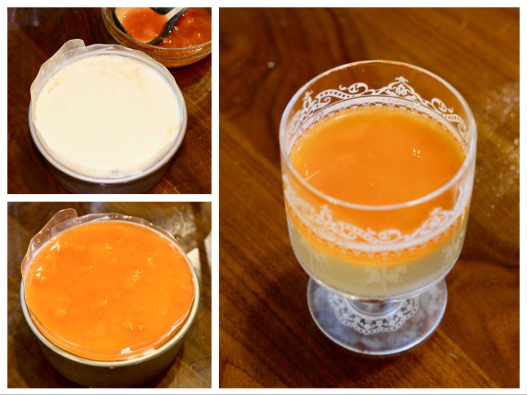 乳酪表面凝固以后,将香杏果糊倒在乳酪层上,再次放回冰箱至蛋糕完全凝固,需要2-3小时。如果有多的乳酪糊和香杏果糊,可以倒入玻璃杯做成杯装的。