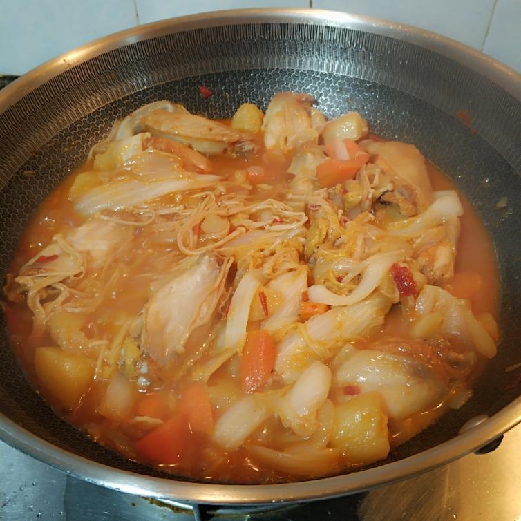 把娃娃菜切条或块; 金针菇切去头后,洗净; 洋葱切块; 红萝卜和土豆切块; 备用。