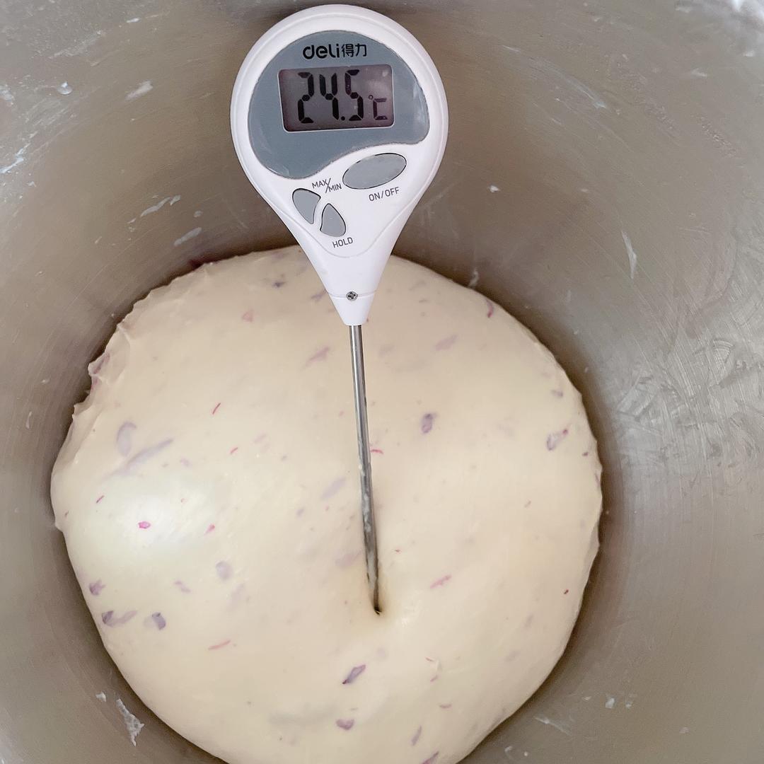 1,夏天可以把面团水解一晚上达到降温和提高面筋的形成,操作如下:把面粉,鸡蛋,白糖,盐,牛奶混合至无干粉后密封冷藏一晚最好一起带上打面桶一起冷藏,第二天起来加入天然种,鲜酵母,玫瑰花瓣低速混合均匀后转6档揉到粗膜,再加入黄油揉至有弹性且薄的膜。
