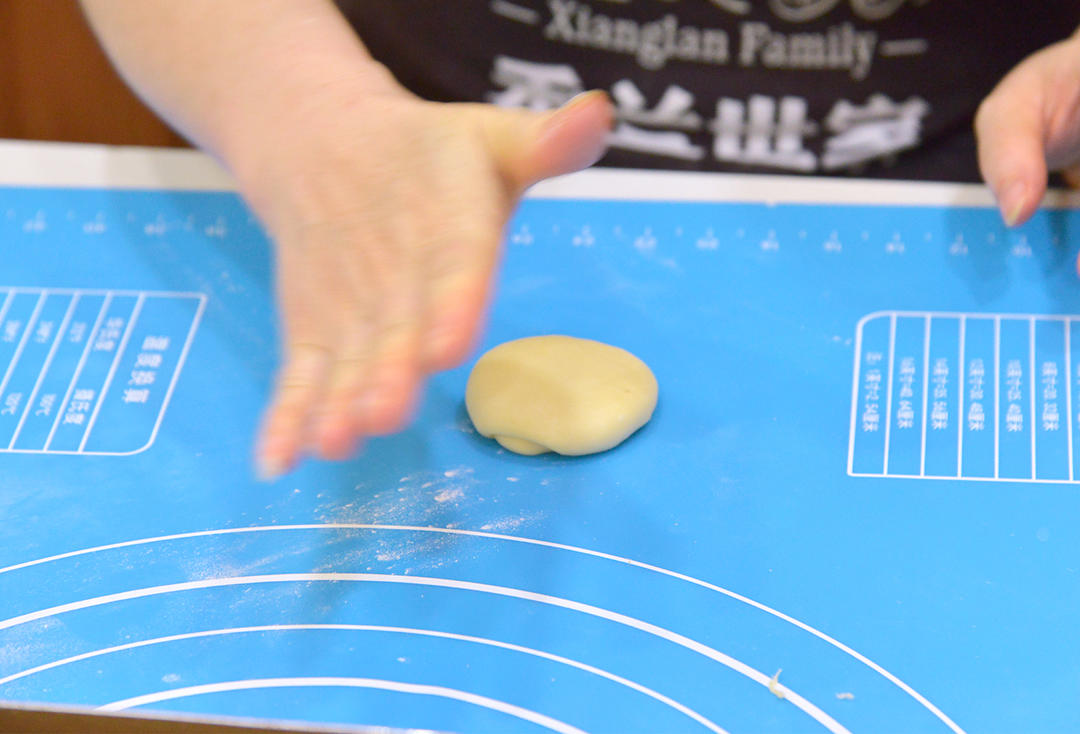三.制作蛋黄肉松馅 1.将豆沙馅揉匀,分为20g/个,在手心压扁;