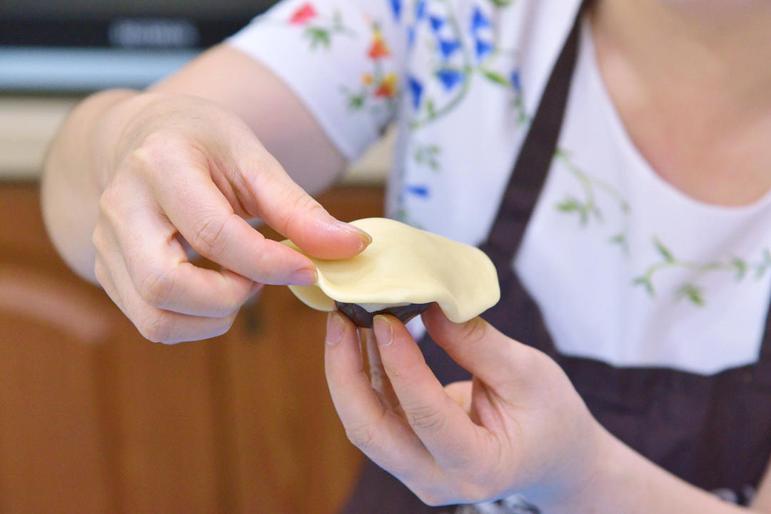 5.收口朝下用擀面杖擀为厚薄均匀大小适中的圆形,光滑面朝外包入馅料收圆;