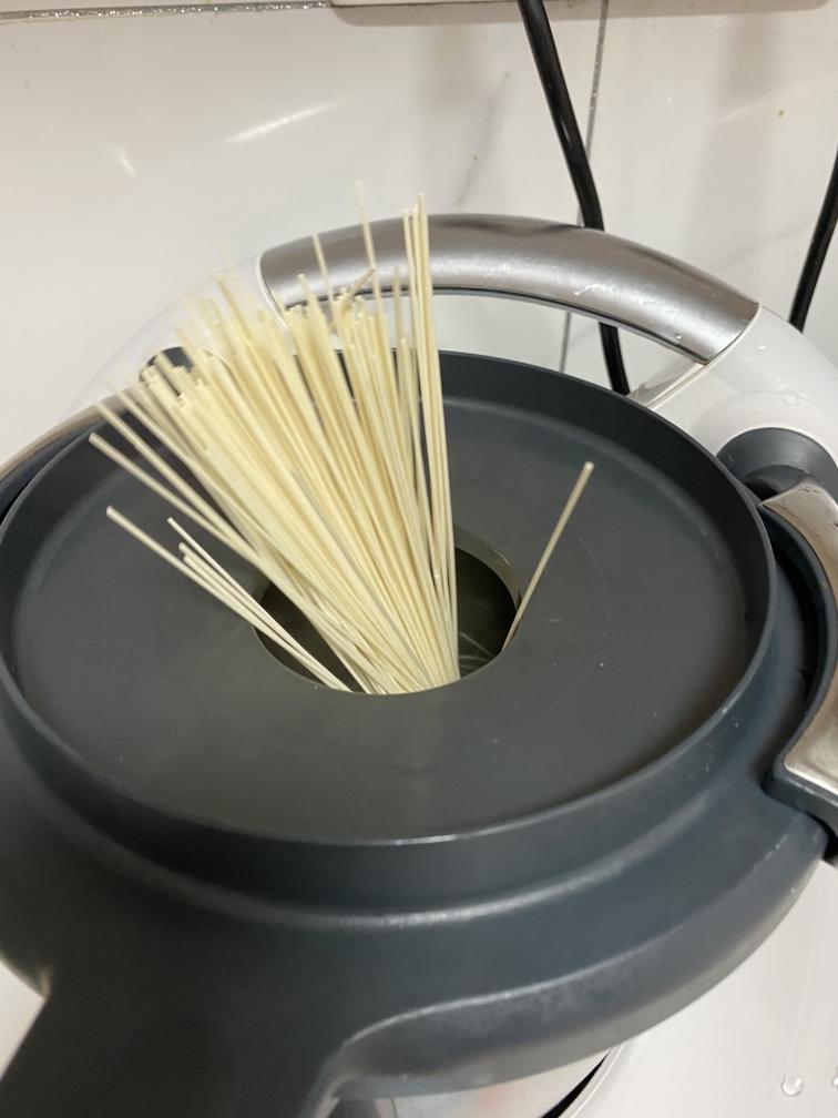 将主锅放在主机上,继续烧水开水煮面了,时间3分钟(根据面团的粗细调整时间)+温度V+反转小勺,拿掉量杯盖加入挂面煮熟,