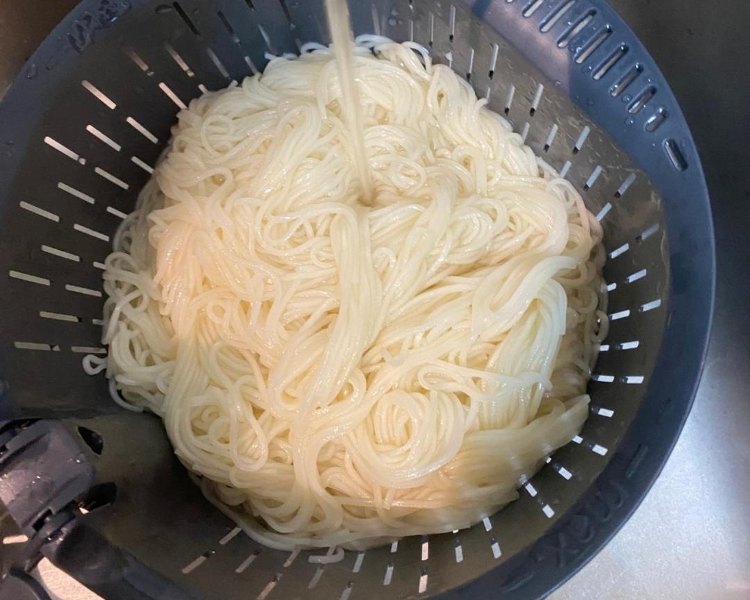 将煮好的面团放入网框,放水龙头下面冲洗,如不喜欢过凉水的朋友,可省略